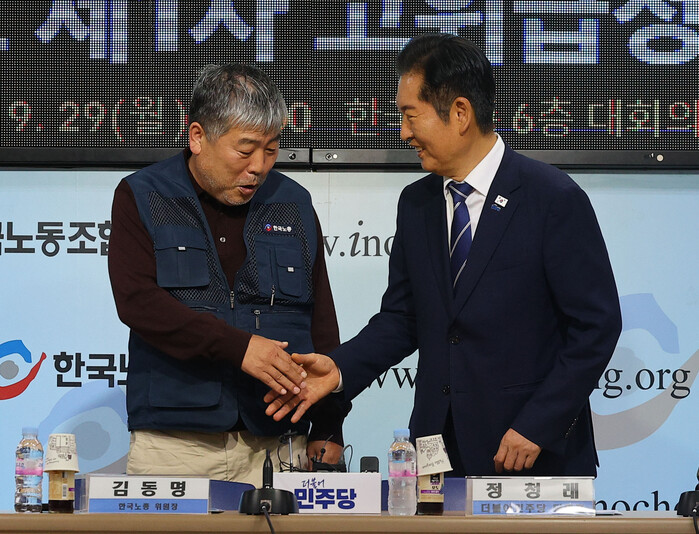 | ▲ 더불어민주당 정청래 대표가 29일 서울 여의도 한국노총에서 열린 한국노총-더불어민주당 2025년도 제1차 고위급정책협의회에서 김동명 한국노총 위원장과 악수하고 있다. 2025.9.29 (사진=연합뉴스) |