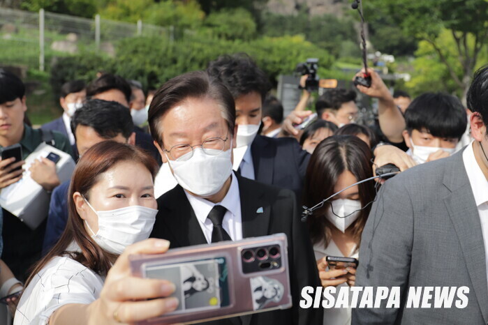 | ▲ 봉하마을을 찾은 시민과 셀카를 찍어주는 이재명 대표 |