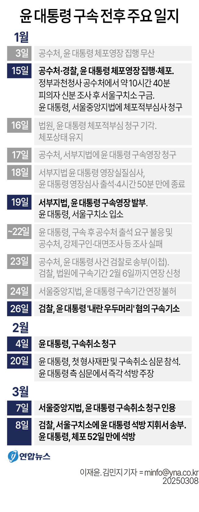 법원의 구속취소 결정으로 8일 석방된 윤석열은 "불법을 바로잡아준 중앙지법 재판부의 용기와 결단에 감사드린다"고 밝혔다.