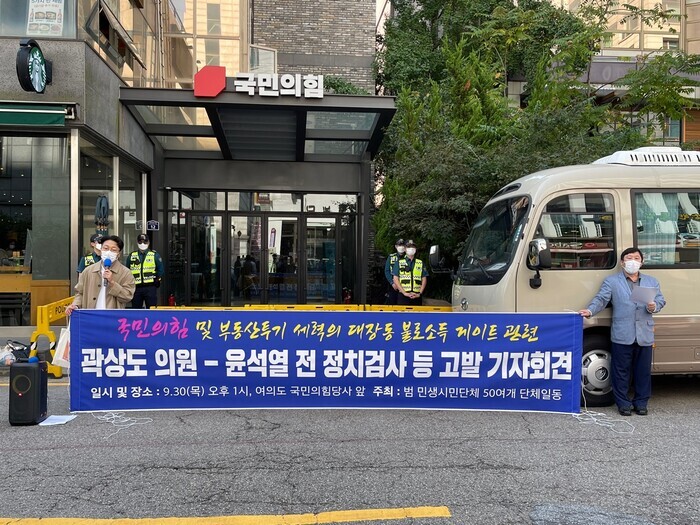앞서 시민단체들은 지난해 9월 30일 이와 관련해 검찰 고발과 함께, 여의도 국민의힘 당사 앞에 모여 "곽상도 전 의원 부자와 윤석열 대선후보 규탄" 기자회견을 가졌었다.