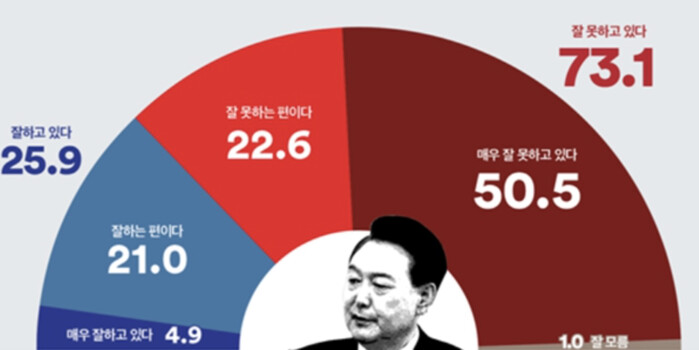 여론조사꽃이 지난 7∼8일 전국 18세 이상 유권자 1,009명을 대상으로 실시한 정기 조사 결과에서도 대통령 지지율은 지난 조사 대비 1.3%p 상승한 25.9%에 머물렀으며 부정 평가는 73.1%(0.3%p 하락)에 달했다. (전화면접조사, 95% 신뢰수준에 표본오차 ±3.1%포인트)