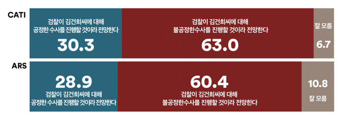 여론조사꽃 자료를 보면 김건희 여사에 대한 검찰 수사 전망에 대해 ‘불공정한 수사 진행’ 의견이 63.0%로 ‘공정한 수사 진행’(30.3%)보다 두배 가량 높게 응답되었다.