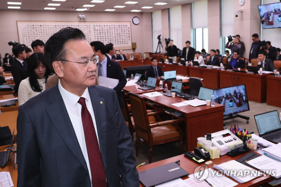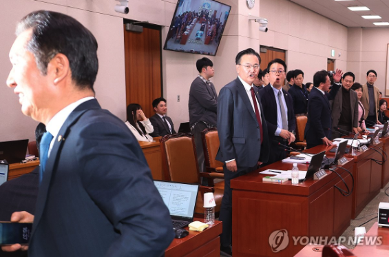 | ▲ 26일 법사위 전체회의에서 국힘 의원들이 항의하며 퇴장하고 있다 (사진=연합뉴스) |