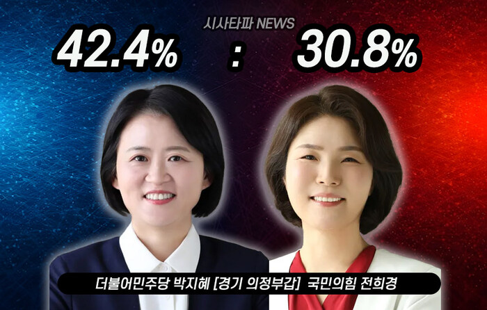 3일 여론조사꽃이 발표한 의정부갑 3자 가상대결 여론조사를 보면 박지혜 후보는 42.4%, 전희경 후보는 30.8%으로 두 후보 간의 지지도 격차는 11.6%p로 오차범위 밖이다.