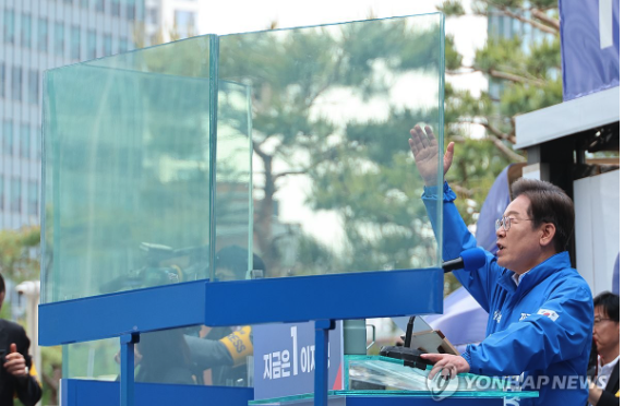 이재명 더불어민주당 대선 후보가 ‘방탄 유리막’이 설치된 연단에서 선거유세를 펼쳤다.