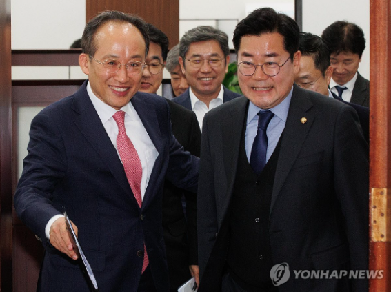 | ▲ 우원식 국회의장이 주재한 양당 원대표 회동에 참석한 추경호와 박찬대 원내대표 (사진=연합뉴스) |