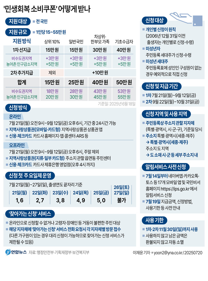 이재명 정부의 첫 대규모 경기 부양책인 '민생회복 소비쿠폰' 신청이 21일 시작됐다. 고물가로 시름하는 국민들의 가계 부담을 덜고 침체된 골목상권에 활력을 불어넣기 위한 이번 정책에 신청 첫날부터 이날 정오 기준 415만 명이 넘는 국민이 몰리며 뜨거운 관심을 보였다. 지급 대상부터 신청 방법, 사용처까지 핵심 내용을 알기 쉽게 정리했다.