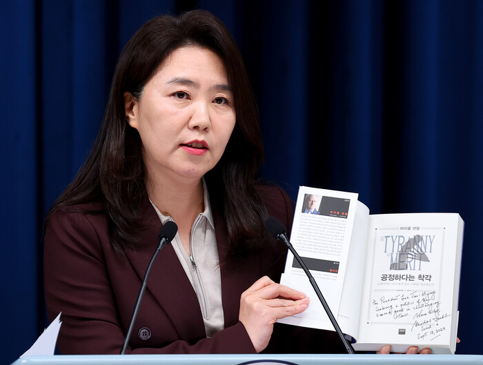 | ▲ 강유정 대통령실 대변인이 18일 서울 용산 대통령실에서 마이클 샌델 교수가 이재명 대통령에게 선물한 책을 펼쳐보이고 있다. 2025.9.18 (사진=연합뉴스) |