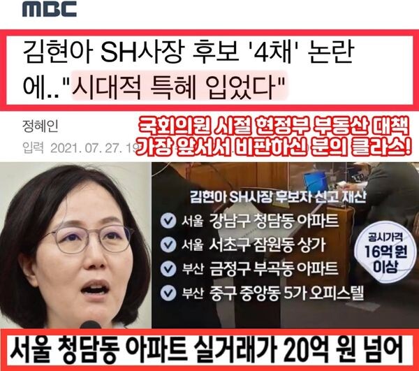 앞서 김 후보자는 27일 서울시의회에서 열린 SH공사 사장 후보자 인사청문회에서 다주택자 논란에 대해 "제 연배상 그때는 지금보다는 내 집 마련이 쉬웠고 주택 가격이 올라 자산도 늘어나는 등 일종의 시대적 특혜를 입었다"라고 주장했다.