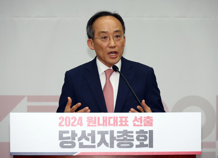추 신임 원내대표는 이날 국회에서 22대 총선 당선인들이 참여한 가운데 열린 경선에서 당선인 102명의 과반인 70명의 지지를 받았다. 경쟁자였던 이종배(충북 충주)·송석준(경기 이천) 의원은 각각 21표와 11표를 얻었다.