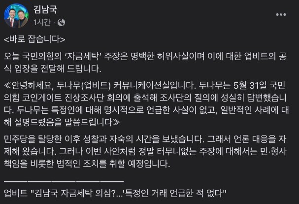 | ▲업비트의 주장을 공유한 김남국의원 페이스북 (화면 캡쳐=김남국 페이스북) |
