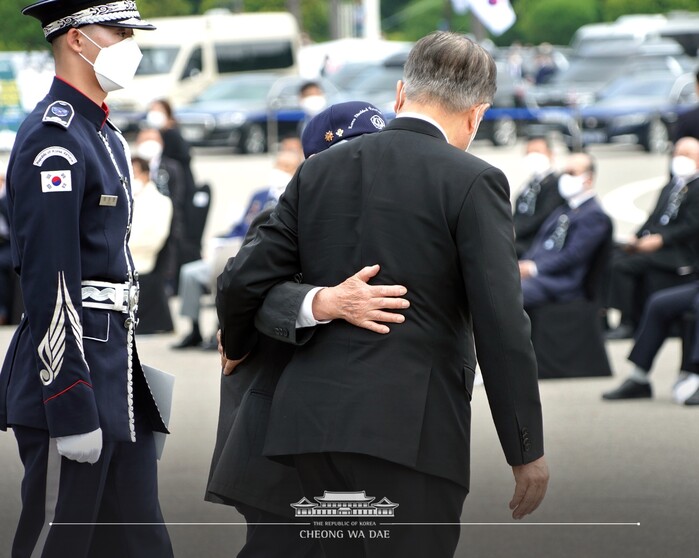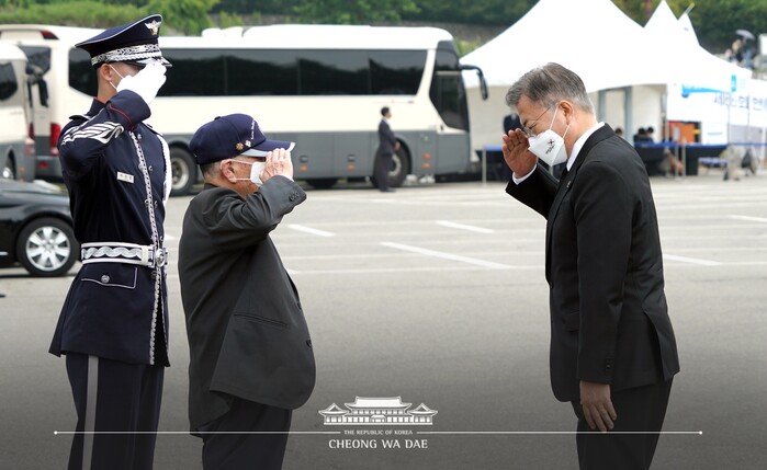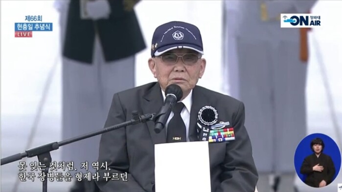 문 대통령은 이어서 창설 60주년을 맞은 국가보훈처를 소개하며 "국가유공자에 대한 진정한 보훈이야말로 애국심의 원천"이라며 "국가가 나와 나의 가족을 보살펴 줄 것이라는 믿음이 있을 때, 우리는 국가를 위해 몸을 바칠 수 있다"고 강조했다.