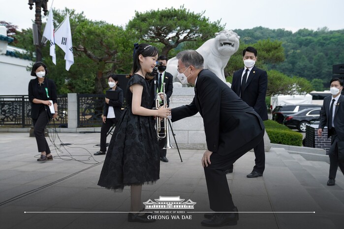 국민의례 마지막 순서인 헌화·분향 및 묵념에서는 국가유공자 후손인 열두 살 트럼페터 곽다경 양이 묵념곡을 연주하는 가운데 문재인 대통령 내외를 비롯한 참석자 30여 명이 함께 순국선열과 호국영령에 대해 예를 표했다.