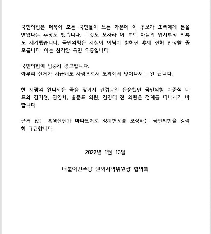 -국민의힘 엄중히 경고,흑색선전.마타도어로 정치혐오조장 강력히 규탄.