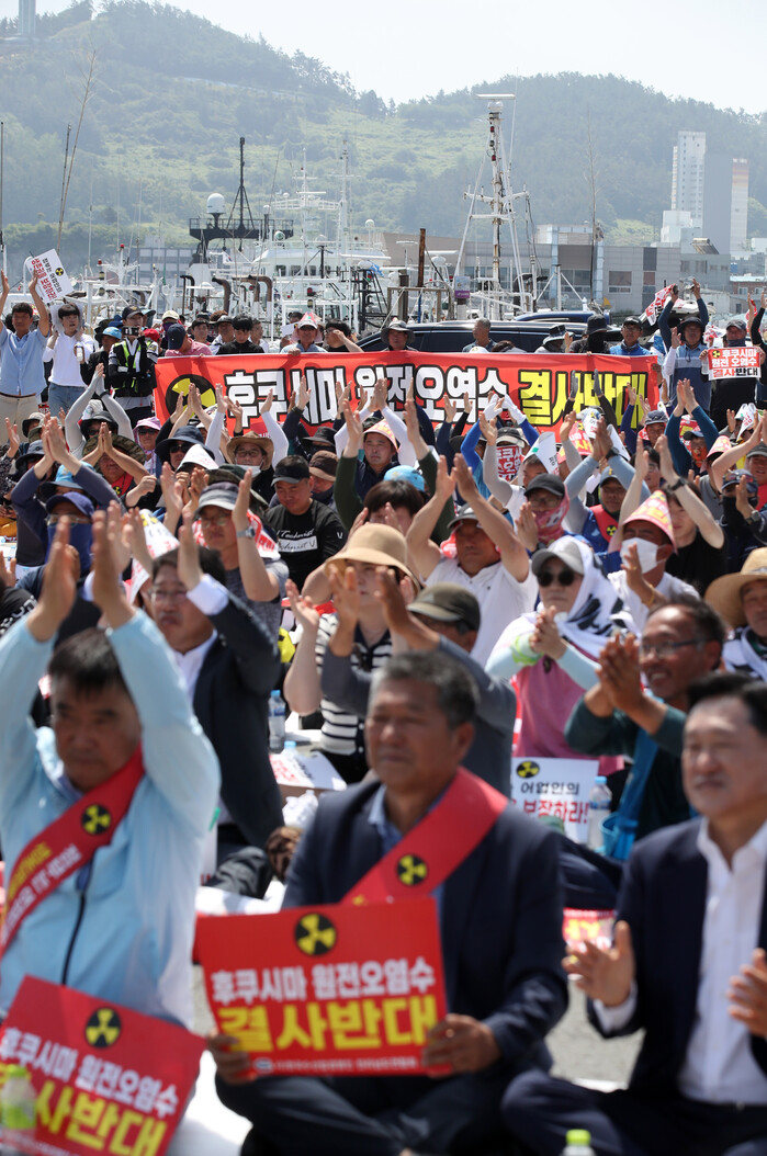 집회 참여 어업인 700여 명(주최 측 추산)은 '후쿠시마 원전 오염수 결사반대' 등의 구호가 적힌 대형 현수막과 손팻말을 들고 결의를 다졌다.