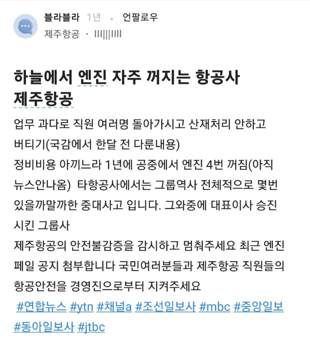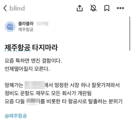 제주항공 직원 인증을 받은 글쓴이는 “요즘 툭하면 엔진 결함이다. 언제 떨어질지 모른다”며 “망해가는 XXXX에서 멍청한 사장 하나 잘못 가져와서 정비도, 운항도, 재무도 모든 회사가 개판 됐다”고 비판했다. 그러면서 “요즘 다들 XXX를 비롯한 타 항공사로 탈출하는 분위기”라며 제주항공을 타지 말라고 덧붙였다.