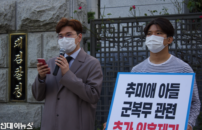 | ▲지난해 9월24일 김태일씨 서초동 대검앞 추미애 법무부장관 아들 군복무와 관련한 기자회견(출처;선데이뉴스) |