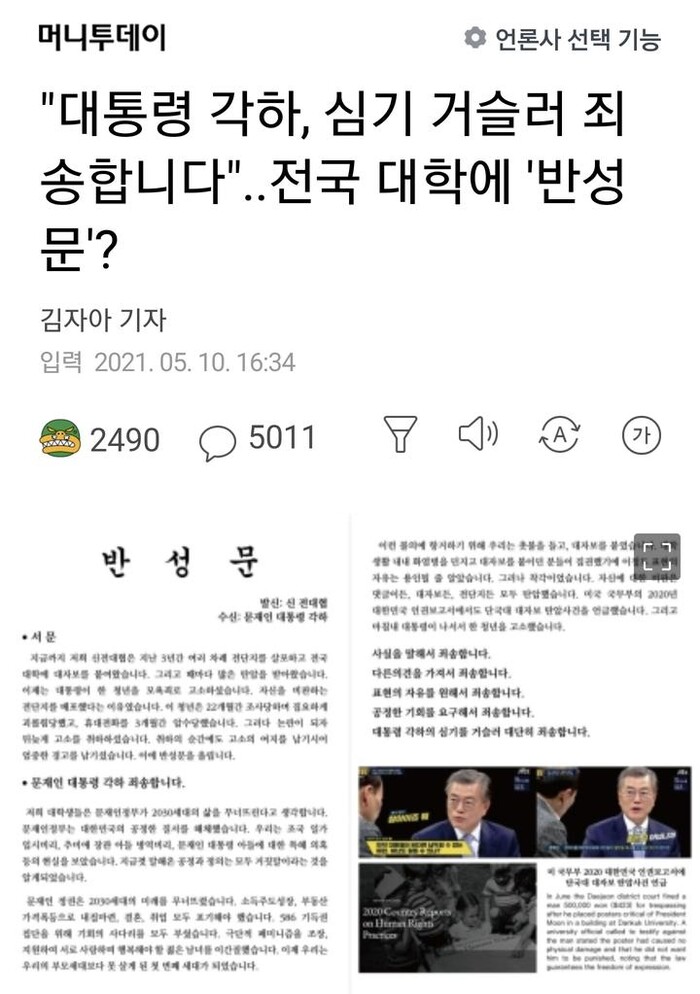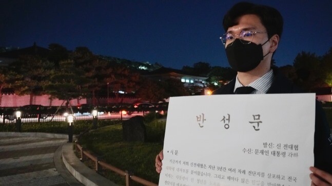 이들이 공개한 대자보에 따르면 반성문의 발신은 '신전대협' 수신은 '문재인 대통령 각하'로 표기돼 있다. 신전대협 의장이라는 김태일 씨는 자신을 비방한 유인물을 뿌린 국힘당 쪽 정치인으로 줄을 댄 김정식 씨를 모욕죄로 고소했다가 취하한 문 대통령을 겨냥해 "'성찰의 계기가 되길 바란다는' 청와대의 지시에 응한 것"이라고 밝혔다.