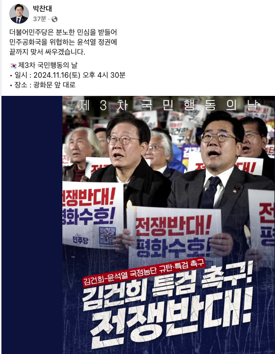 | ▲ 더불어민주당 박찬대 원내대표 게시글 (출처=박찬대 페이스북_ |