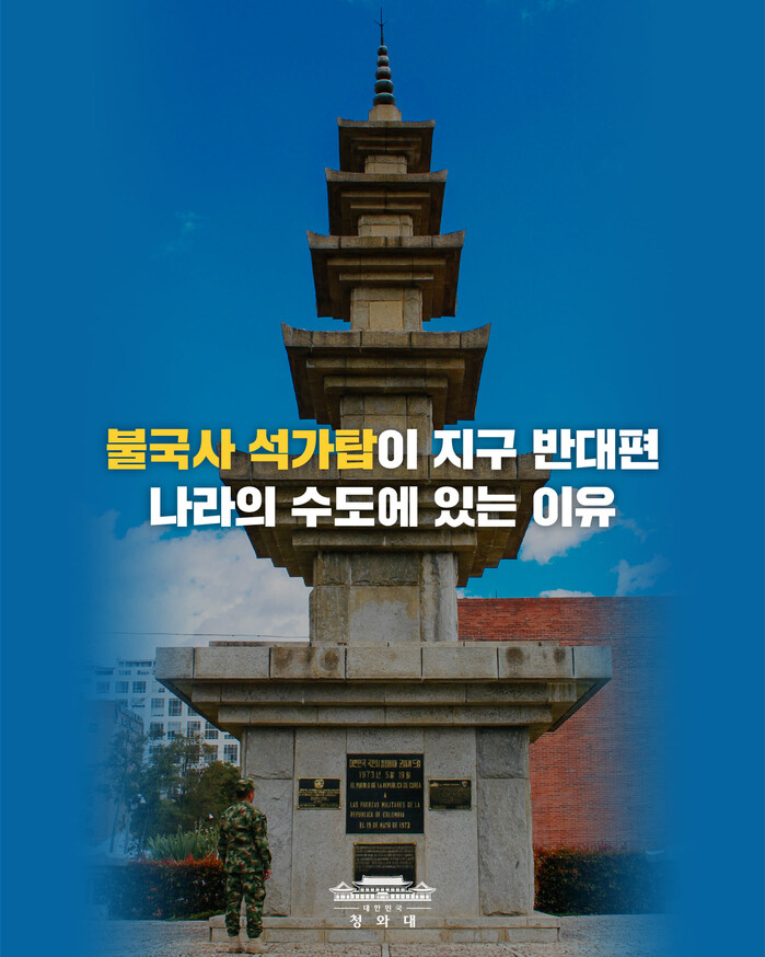중남미 국가 콜롬비아의 수도 보고타에 위치한 국방대학교 안에는 우리의 눈에 친숙한 탑이 세워져 있다. 우리나라의 국보 제21호인 석가탑을 닮은 12m 높이의 탑이다. 사실 콜롬비아는 우리 국민에게 많이 알려지지 않았지만, 6.25전쟁 때 중남미에서 유일하게 전투병을 파병한 우리의 혈맹이다. 그래서 우리 정부는 1973년, 감사의 뜻으로 전사한 장병들의 이름을 새긴 석가탑을 제작해 콜롬비아에 선물했다고 한다.