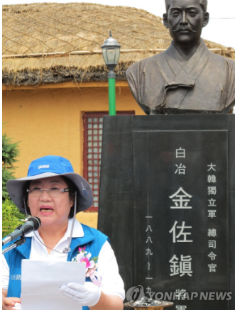 | ▲ 2010.7.5 당시 김을동 미래희망연대 의원이 김좌진 광장 개관식에서 개관사 하는 모습 (사진=연합뉴스) |