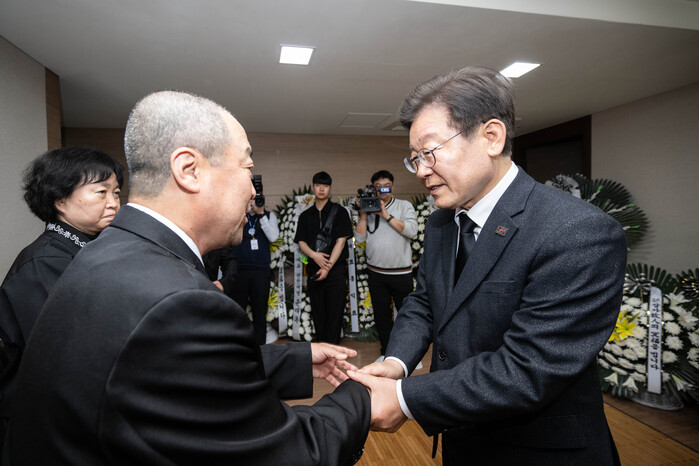 이재명 더불어민주당 대표는 18일 오후 고(故) 박종철 열사의 어머니 정차순 여사 빈소가 마련된 서울 강동성심병원 장례식장을 찾아 애도의 뜻을 표했다.