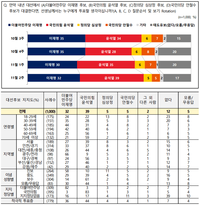 이재명 36%, 윤석열 25%, 안철수 7%, 심상정 3% 등의 순