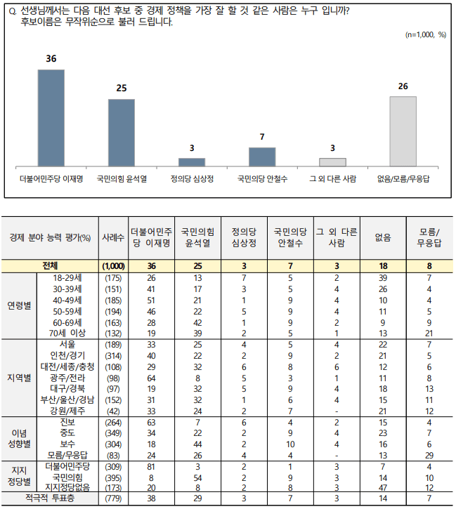 전국지표조사 NBS (2021년 11월 2주) 조사에 따르면 경제 정책을 가장 잘 할 것으로 생각되는 후보로는 ‘더불어민주당 이재명’ 36%, ‘국민의힘 윤석열’ 25%, ‘국민의당 안철수’ 7%, ‘정의당 심상정’ 3% 등의 순으로 나타났다.