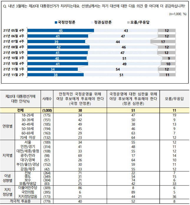 ☞ 11월 1주 조사 대비 정권 심판론과 국정 안정론의 격차 다소 줄어듦. (20%p → 13%p)