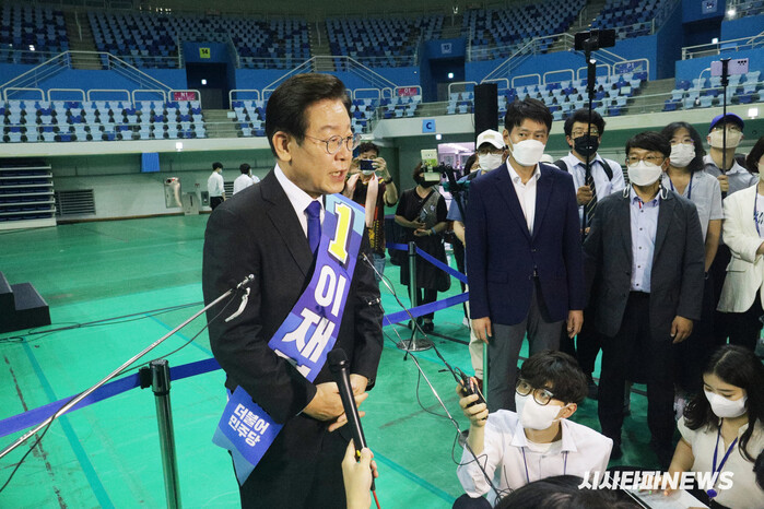 | ▲ 투표 결과 발표 후 짧은 인터뷰 중인 이재명 후보 |
