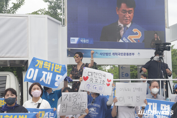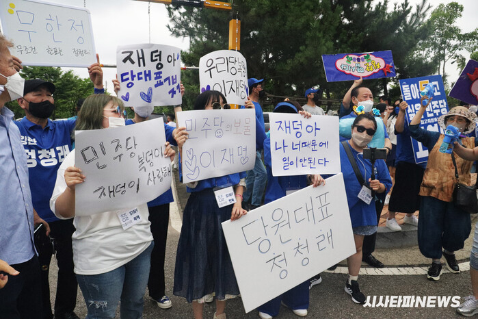 | ▲ 이재명과 정청래를 응원하는 당원들. 각종 피켓이 눈에 띈다. |