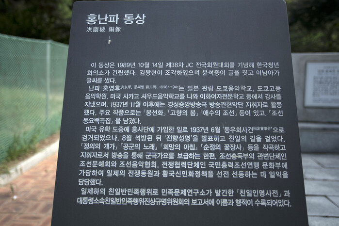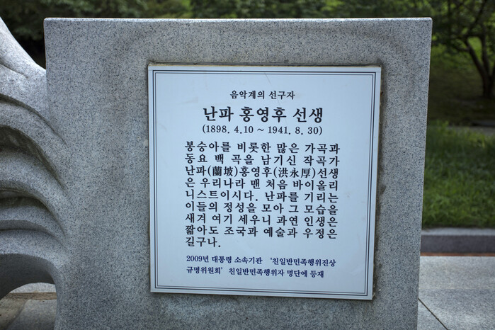 | ▲홍난파 동상에 기재된 친일반민족행위자 명단 등재 안내 (사진=시사파타뉴스 이만우) |