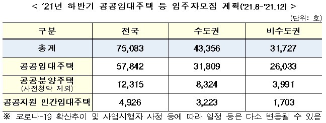 국토교통부는 올해 하반기 공공임대와 공공분양, 공공지원 민간임대주택 총 7만 5083가구에 대한 입주자를 모집한다고 3일 밝혔다. 구체적으로 공공임대 5만 7842가구, 사전청약을 제외한 공공분양 1만 2315가구, 공공지원 민간임대 4926가구 등이다.