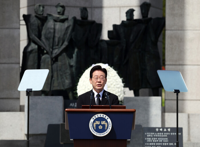 이 대통령은 19일 서울 강북구 국립4·19민주묘지에서 열린 기념식에서 “서슬 퍼런 독재의 사슬을 끊어낸 4·19 정신은 부마항쟁, 5·18, 6월 항쟁, 촛불혁명과 빛의 혁명으로 이어졌다”며 “참된 주권자의 나라를 향한 연대의 힘이었다”고 말했다.