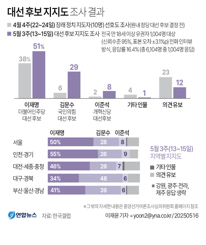 한국갤럽이 13~15일 조사해 이날 발표한 여론조사 결과에 따르면, 6·3 대선 주요 후보 지지도는 △이재명 51% △김문수 29% △이준석 8%로 각각 집계됐다. 이 후보는 이날 처음으로 지지율 40%와 50% 벽을 한 번에 돌파했다. 지난 조사(38%)와 비교해 13%포인트(p) 껑충 뛴 수치다. 김 후보는 정확히 국민의힘 2차 경선에 진출했던 4명(김문수, 안철수, 한동훈, 홍준표)과 한덕수 전 국무총리의 4월 4주차(후보 확정 전) 지지도 합계(29%)만큼의 지지율을 얻었다.
