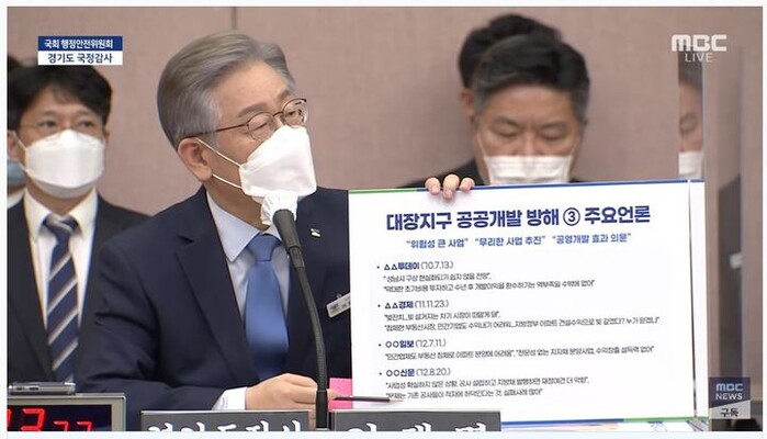 이 후보는 이날 국감에서 대장지구 개발사업을 완전 민영, 민관공동, 완전 공영으로 진행했을 경우 예상 수익배분액이 나온 피켓을 꺼내들고는 "민간개발하면 다 가졌을텐데 제가 다 뺐겠다고 주장해서 그들이 얼마나 당황했겠나. 제가 원수였을 것"이라고 받아쳤다.