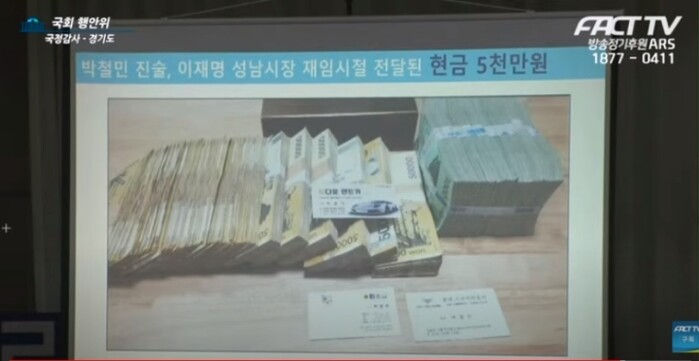 김용판 의원이 박씨가 이 후보의 성남시장 재임 시절 현금 1억원을 전달했다며 현금다발 사진을 공개하자, 이 후보는 기막힌듯 웃으면서 "어디서 찍었는지 모르겠지만 참 노력을 많이 하신 것 같다"라고 꼬집었다.