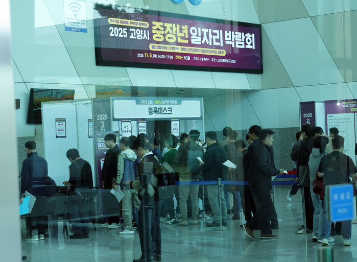 | ▲ 경기 고양시 킨텍스에서 열린 '2025 고양시 중장년 일자리 박람회'에서 구직자들이 이력서를 작성하고 있다. 2025.11.6 (사진=연합뉴스) |
