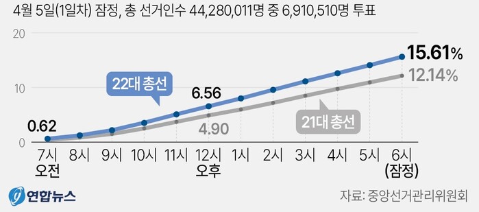 22대 총선 사전투표 첫째 날인 5일 전국 평균 최종 투표율이 15.61%로 나타났다. 역대 총선 사전투표 첫날 투표율과 비교했을 때 가장 높은 수치다.