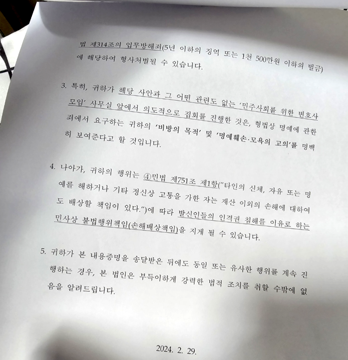 민변앞 집회 참가자들을 내용증명으로 겁박하는 듯 보여 논란