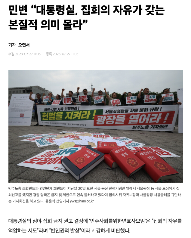 그러면서 “(집회의 자유는) 형식적인 다수결 내지 의견수렴을 근거로 그 본질적 내용을 침해할 수 없는 기본권이다. 그런데도 대통령실이 제한된 공간에서의 다수 의견이라는 이유로 집회·시위 요건 및 제재 강화를 추진하는 것은 집회의 자유가 갖는 본질적 의미를 망각한 것”이라고 비판했다.