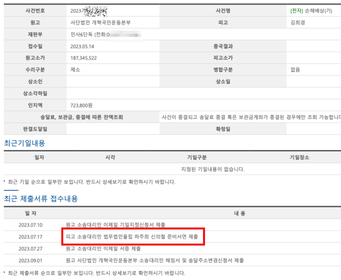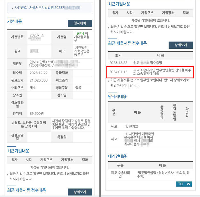 문제는 2023년 9월 21일 집회행사의 대행사가 비용 지급을 요청하며 2천 102만원을 지급하라고 개국본을 상대로 한 소송에서는 하 변호사와 신 변호사가 이번에는 개국본 측의 입장에서 소송을 맡았다는 것이다.