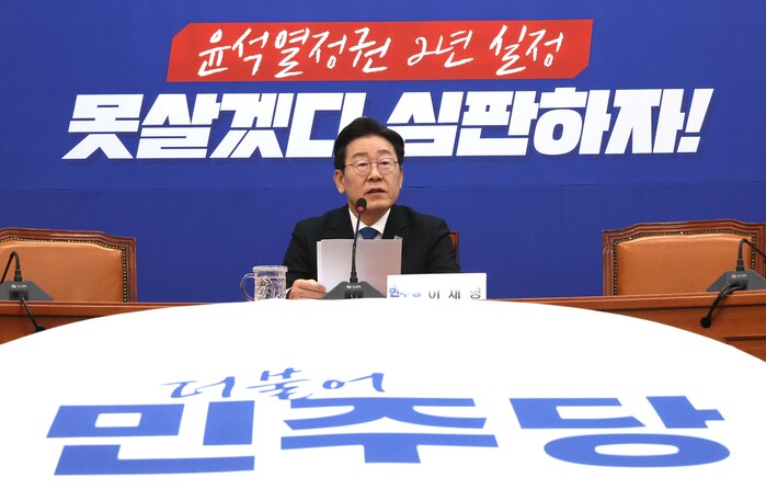 이 대표는 "윤석열 정권은 2년간 나라를 망치고도 어느 것 하나 책임지지 않는다"며 "국정 실패를 책임지기는커녕 오히려 그 책임자들에게 국회의원 후보 공천장으로 꽃길을 깔아주는 패륜 공천을 했다"고 주장했다.