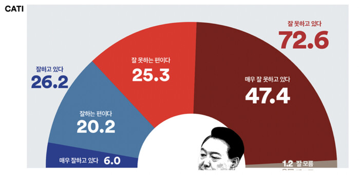 여론조사꽃이 같은 날 조사한 대통령 지지율은 긍정 평가 26.2%, 부정 평가 72.6%로 탄핵 찬성 여론과 대통령 부정 평가 사이의 갭(GAP)은 15.6%p였다.