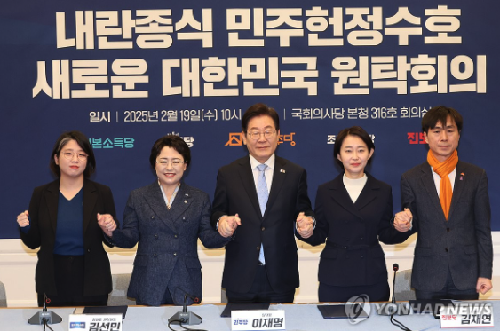 | ▲ 19일 '내란 종식 민주 헌정 수호 새로운 대한민국 원탁회의' 출범식.왼쪽부터 기본소득당 용혜인 대표, 조국혁신당 김선민 대표 권한대행, 더불어민주당 이재명 대표, 진보당 김재연 상임대표, 사회민주당 한창민 대표 (사진=연합뉴스) |