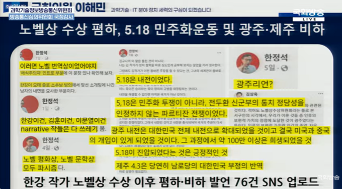 특히 논란을 빚은 발언은 한강 작가의 노벨문학상을 "노벨번역상"이라 폄하하며 '5·18은 내전' '5·18은 전두환 신군부를 인정하지 않는 파르티잔 전쟁' '노벨 평화상·문학상은 파시즘' 등 극우적 발언이었다.