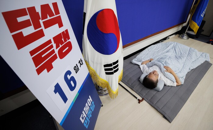 단식 17일째인 이 대표는 누운 상태로 고영재 한국독립영화협회 대표 등 문화예술계 인사들을 접견했다.
