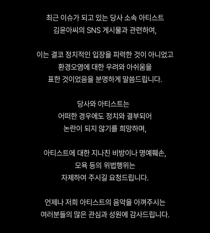 이어 "당사와 아티스트는 어떠한 경우에도 정치와 결부되어 논란이 되지 않기를 희망한다"고 덧붙였다.