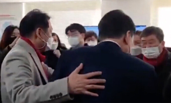 | ▲尹후보 안내하는 전씨, 지난 1일 서울 여의도 대하빌딩에 위치한 국민의힘 선거대책본부 하부 조직인 네트워크본부 사무실에서 무속인 전모씨(왼쪽)가 윤석열 대선 후보를 이끌며 관계자들과 인사하도록 안내하고 있다. 출처=유튜브, 셰계일보 |