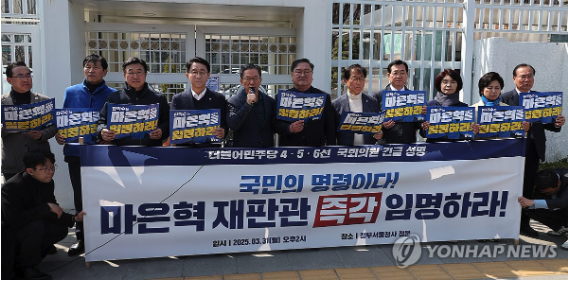 | ▲ 31일 마은혁 재판관 임명 촉구하는 민주당 의원들 (사진=연합뉴스) |